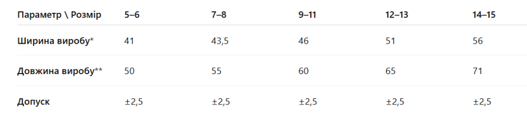 Розмірний ряд: 116 – 128 – 140 – 152 -164