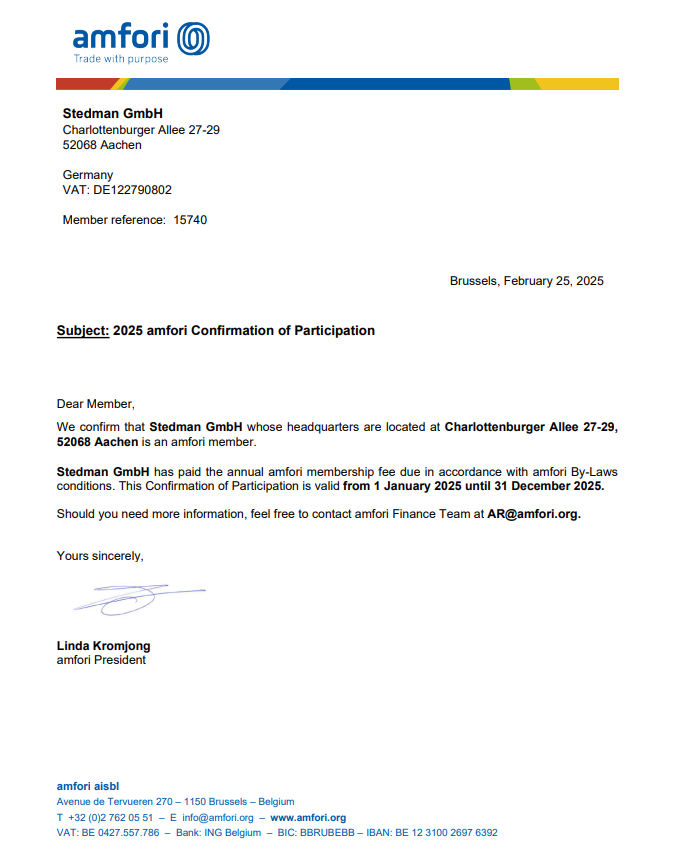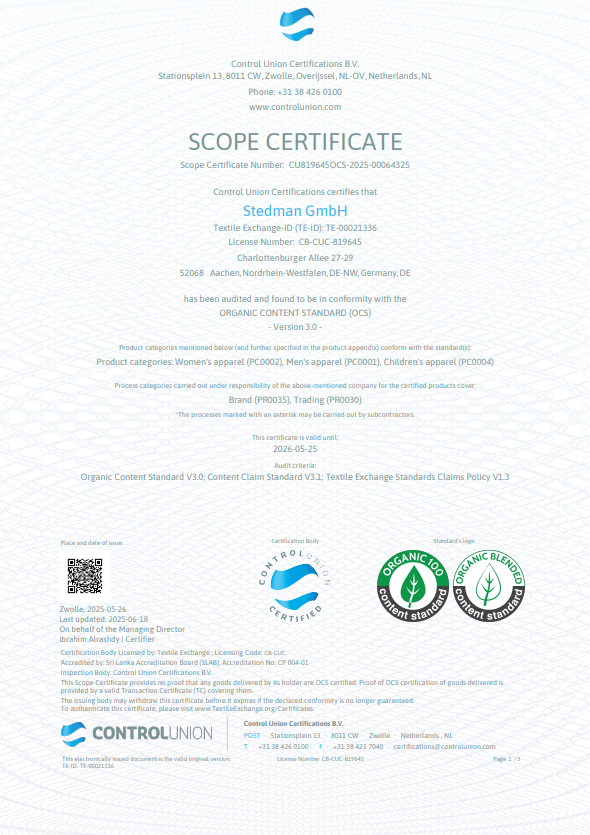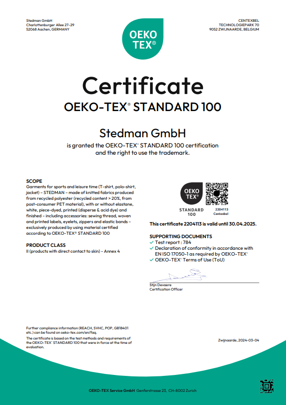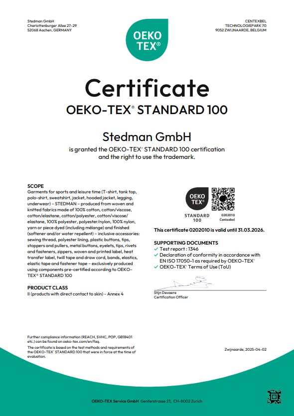 Вся одежда Stedman имеет международные сертификаты качества и безопасности: OEKO-TEX®, OEKO-TEX® ORGANIC, OEKO-TEX® RECYCLED, ORGANIC CONTENT STANDARD, PETA Approved Vegan, AMFORI BSCI. Это подтверждает экологичность, безопасность и соответствие международным стандартам.